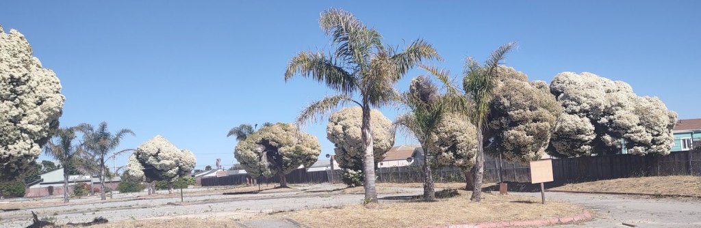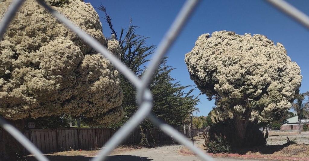 In my seventh California spring, I finally remembered to take pictures of the cauliflower trees. These are behind a fence, perhaps a rabbit-proof one? I love these trees because they are a sort of combination of California and Texas, a giant-sized version of a healthy food. As the Internet has taught us, a picture is proof of reality. Can you deny that these are real?