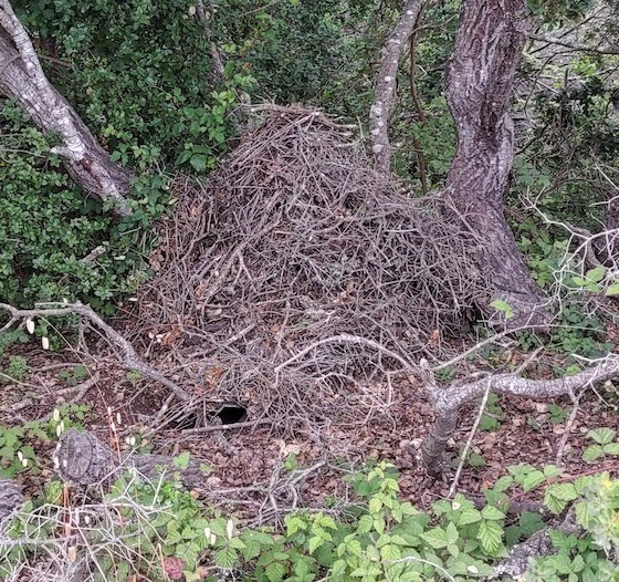Although I’m sedentary when working on a game, I also enjoy wasting time in physical activities, which when combined with a shower can easily mop up several hours. What’s more fun than a Zumba class at the gym? I walk with friends several times a week, and hike with a Meetup group at least twice a month. Last week, in the hills above Wilder ranch, the trail had been moved, allowing us a rare glimpse of a wood rat nest. Neither wood rats nor their nests are actually rare, at least not according to my fellow hikers, but their nests are usually hidden farther from people paths. This one is about three feet tall and has a visible entrance, and probably also a back door.